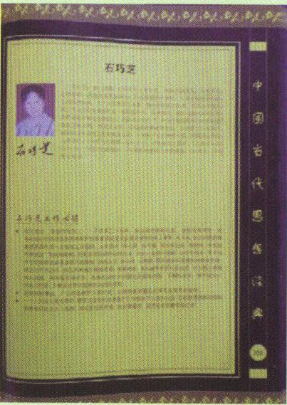 石巧芝大夫在医学领域做出了卓越的贡献和成绩,已被载入《中国当代思想经典》中。